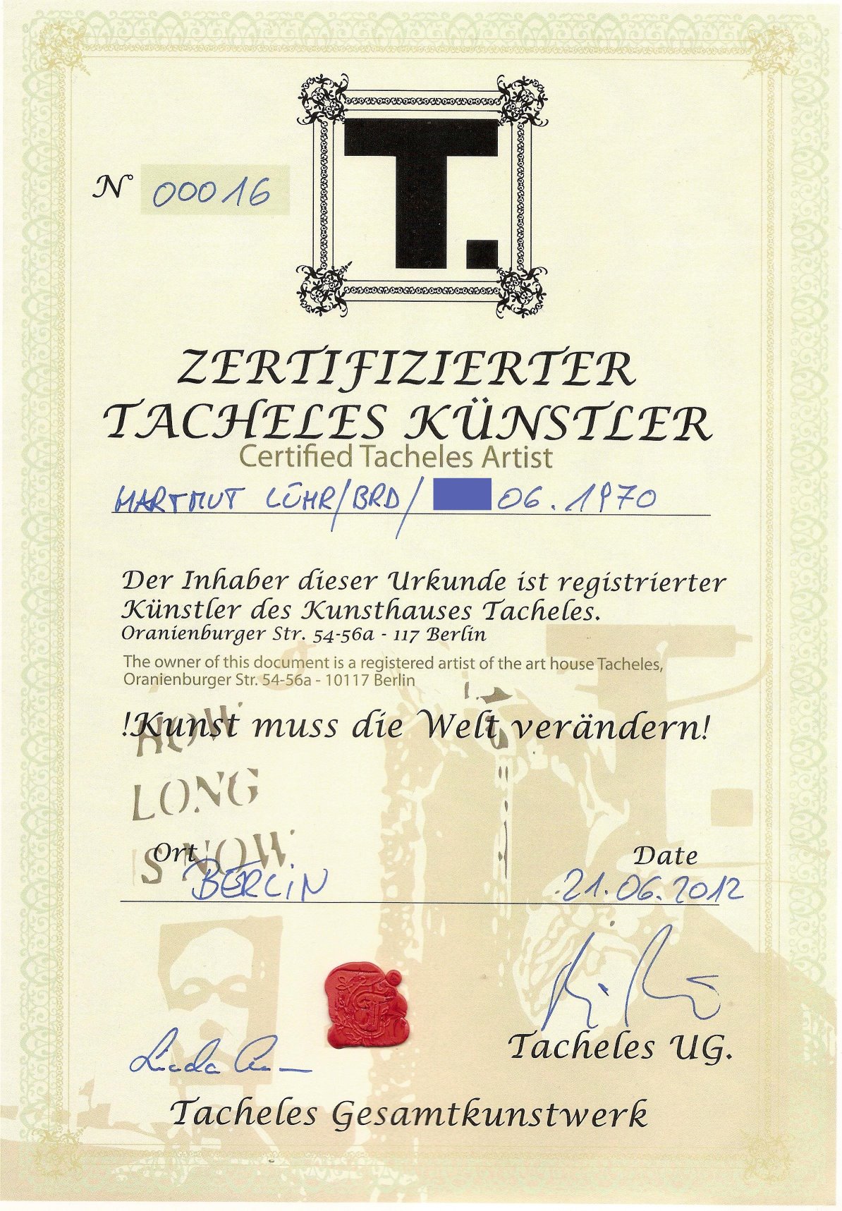 Trotz dreieinhalb Jahren zähen, kreativen und friedlichen Widerstandes wird das `Kunsthaus Tacheles´ im September 2012 auf Betreiben der HSH-Nordbank von der Polizei geräumt - eine empfindliche Niederlage für Lühr und seine Politik- und Kunstplattform `moderne21´. Immerhin gehört er weiterhin zum kleinen Kreis zertifizierter Tacheles-Künstler - einem Titel, den sich die Macher des Kunsthauses von den marodierenden Finanzspekulanten nicht nehmen lassen. Dem Umzug der Kernbelegschaft der `Tachelesen´ aus der Berliner KREATIVEN MITTE ins angesagte, wenn auch deutlich abgelegenere, Neuköllner `Rollbergviertel´ folgt er allerdings nicht.